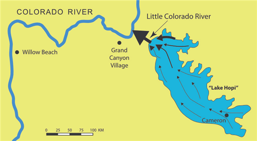 그림 4. "호피 호수"와 리틀콜로라도 강 캐니언의 가정되고 있는 물 흐름의 개략도.