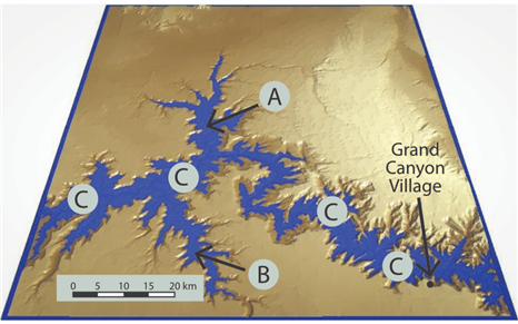 그림 5. 애리조나주 그랜드 캐니언의 95km 주요 구간. 노아의 홍수가 물러가면서 수위가 상승한 모습을 디지털 시뮬레이션으로 보여준다. 콜로라도 강(C)은 오른쪽에서 왼쪽(동서)으로 흐른다. 화살표로 표시된 두 개의 주요 측면 캐니언(side canyons)은 북쪽의 카나브 캐니언(Kanab Canyon, A)과 남쪽의 하바수 캐니언Havasu Canyon, B)이다.