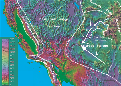 이상하게도 그랜드 캐니언은 겉보기에 있을 수가 없는 곳에 위치해 있다. 그랜드 캐니언 빌리지에서 동쪽으로 약 32km 떨어진 곳에서 콜로라도 강은 남쪽에서 서쪽으로 급격하게 90도 방향을 틀어 융기한 카이밥 고원의 중심부로 흘러간다... 강은 동쪽으로 인접한 마블 플랫폼(Marble Platform)보다 900m가 높은 이 융기된 암벽을 관통하여 흘러가고 있다.[17]