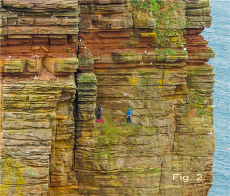 시스택에는 수평 퇴적층, 즉 층(strata)들이 차곡차곡 쌓여 있다. 가파른 절벽에서도 층들이 보인다. 멀리서 보면 층들은 그다지 커 보이지 않는다. 그러나 시스택을 등반하는 사람들을 보기 위해 가까이 다가가 보면(그림 2), 일부 층의 두께가 약 1.8m에 달하는 것을 알 수 있다. 이는 상당한 양의 퇴적물이 이 지역으로 운반되었음을 시사한다.