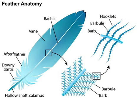 일반적인 새의 깃털은 깃대(rachis, 우축)라 불리는 중심축에 얇은 깃가지(barbs)들이 확장되어, 깃털의 날개(vane, 판)라 불리는 평평한 표면을 형성한다. 그런 다음 깃가지는 인접한 작은깃가지(barbules)의 작은 고리(hooks, hamuli)들과 맞물려 강하지만 유연한 표면을 형성한다.