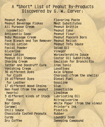 카버는 목화 농사로 영양분이 고갈된 땅을 되살리기 위해, 땅콩(peanuts)과 콩(soybeans)과 같은 토양을 비옥하게 하는 작물을 재배하여 농업 과학에 혁명을 일으켰다. 그는 고구마가 100가지 이상으로 재료로 사용되고, 땅콩이 음료, 화장품, 염료 및 페인트, 의약품, 식품... 등 300가지 이상으로 사용된다는 것을 발견했다. 그는 의학 및 기타 분야에 기여한 수많은 연구 프로젝트를 수행했으며, 인종 갈등의 완화를 옹호하기 위해 자신의 영향력을 사용했다.